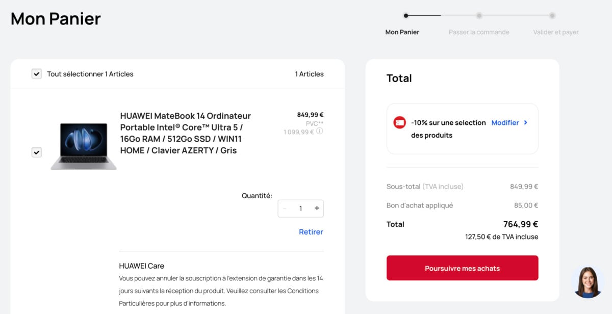 Le prix réduit du Huawei MateBook 14 après application du code promo A10PRIVILEGE sur le site officiel.