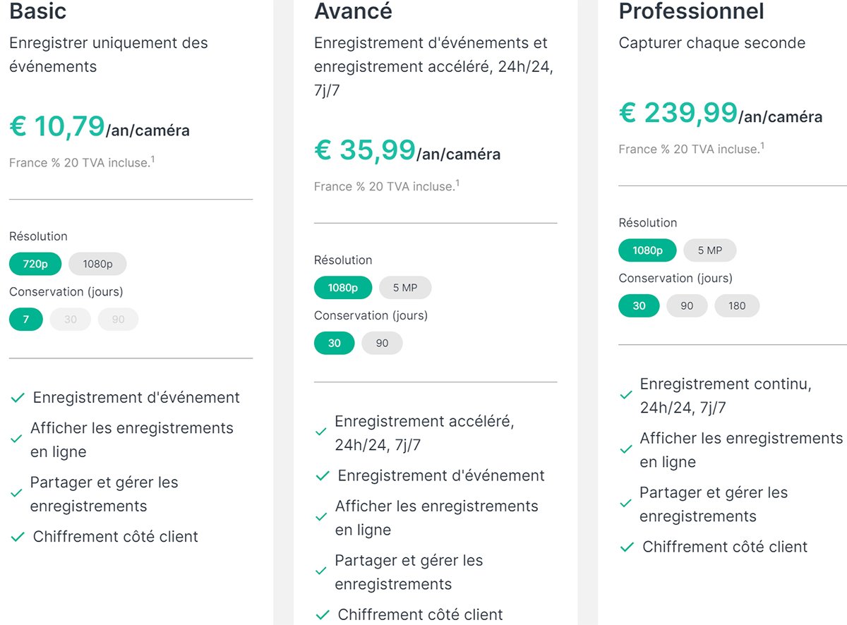 L’option Avancé, quant à elle, offre 30 jours de vidéos en 1080p, avec en plus des enregistrements accélérés 24h/24, 7j/7. L’abonnement le plus coûteux offre en plus le stockage de vos enregistrements en continu. Les deux premiers abonnements sont suffisants et leurs prix « raisonnables », sauf si vous multipliez les caméras.