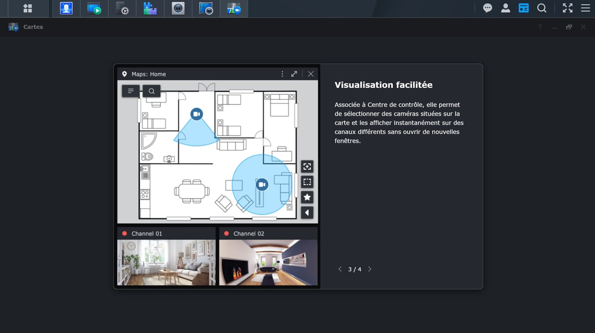 Synology Surveillance Station est l’application qui centralise l’ensemble des outils de surveillance proposés par Synology. En complément, il existe une application nommée Synology Surveillance Station pour PC, qui permet d’exploiter les mêmes fonctionnalités que celles disponibles sur le NAS, notamment celles liées à l’intelligence artificielle (IA), certaines étant exclusivement utilisables depuis cette application.