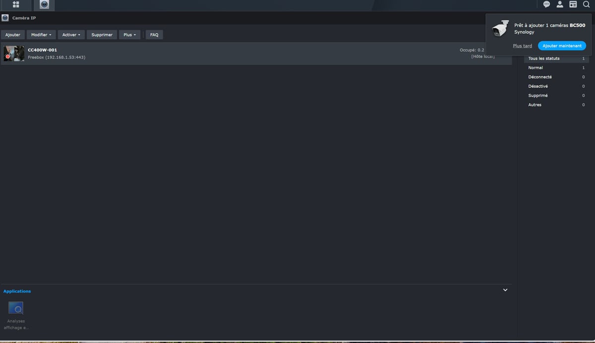 Cependant, les fonctionnalités de surveillance avancées basées sur l’IA sont réservées aux caméras Synology. Cela dit, les alertes basiques (détection de mouvement, par exemple) fonctionneront avec d’autres caméras. L’installation des caméras est simple : le NVR détecte automatiquement les caméras IP connectées. Seule la CC400W nécessite un processus d’installation spécifique via l’application DSM Cam.