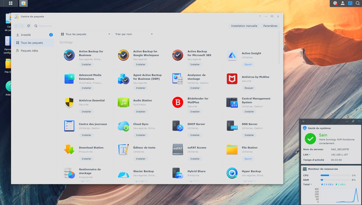 En pratique, l’interface réagit rapidement, et les seuls moments de réelles attentes sont les quelques secondes nécessaires pour lancer les applications les plus lourdes ou lors des changements de flux vidéo. Pour le reste, la fluidité est bien au rendez-vous. Cependant, nous n’avons pas testé d’autres fonctionnalités qui, bien que disponibles, comme l’installation d’un serveur Plex, risqueraient de réduire les performances du NAS. Pour du stockage multimédia, Synology propose d’autres produits plus économiques et adaptés.