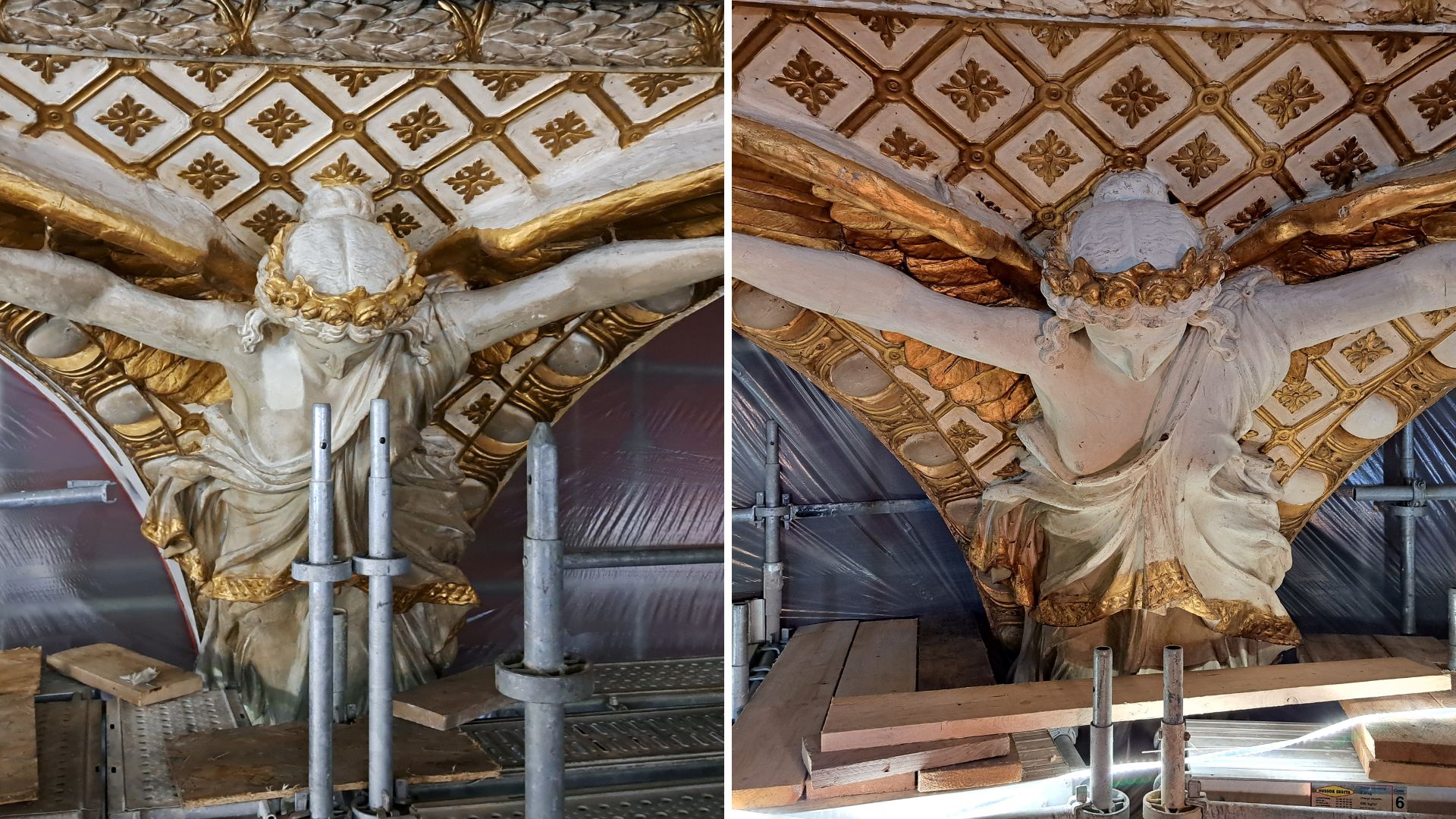 Et la grande toile n’est pas la seule à avoir besoin d’un coup d’éclat. Parmi les décors, les victoires aillées « étaient grises » ce qui donnait d’ailleurs cet aspect sombre à la pièce. Après restauration, elles vont retrouver leur couleur blanche et dorée. « Nous sommes vraiment sur un décor de théâtre en carton-pierre. Autrement dit, il s’agit d’une fine couche d’enduit sur laquelle on vient mettre de la couleur et de la dorure. C’est donc très fragile et cela nécessite des techniques de nettoyages particulières », détaille l’architecte.