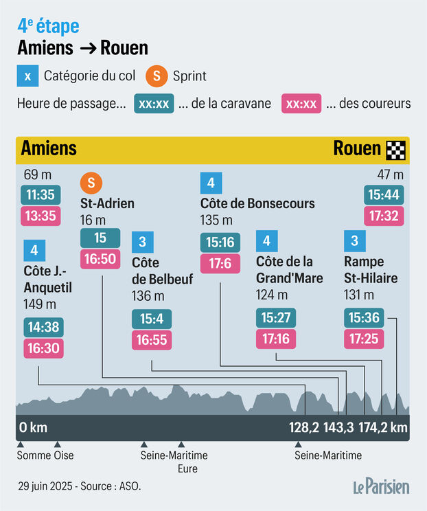 Le Tour de France ensuite la région des Hauts-de-France pour rallier la Normandie avec l’étape 4 et 174 km vallonnés entre Amiens et Rouen. Le tracé devient plus sélectif dans les 30 km finaux avec quatre côtes : Bonsecours (900 m à 7,2%), Grand-Mare (1,8km à 5%), Saint-Hilaire (900m à 10,6%) et une dernière ascension courte mais raide, jusqu’à 15 %. Sans doute trop difficile pour le commun des sprinteurs, particulièrement si les meilleurs puncheurs lancent les hostilités d’assez loin.
