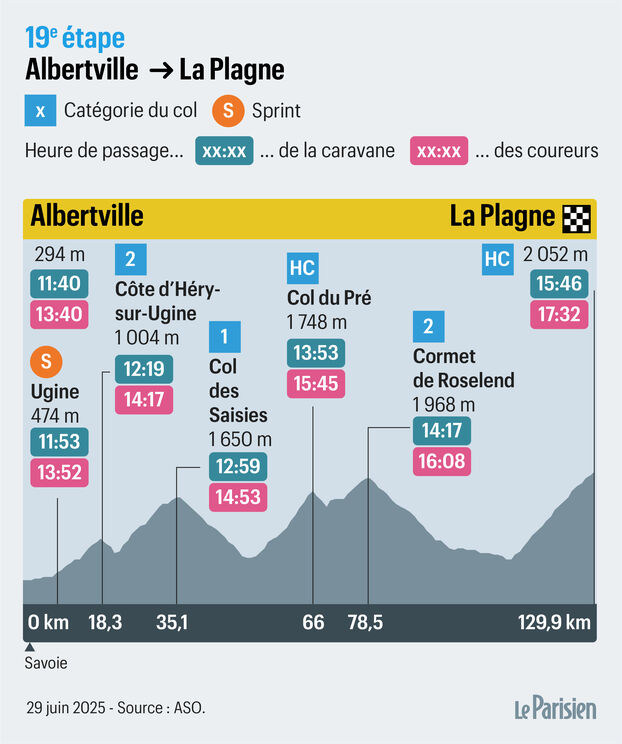 Dernière chance pour les favoris de se faire la guerre, dernier effort pour ceux qui n’ont juste plus qu’une seule ambition dans ce Tour de France : rallier Paris. Entre Albertville et la Plagne, une courte étape de 130 kilomètres pour marquer la fin de la montagne, mais elle n’est pas à prendre à la légère pour autant : 5 cols, deux deux hors catégorie. Avec le Col du Pré (12,6km à 7,7%), les hostilités pourront débuter et se termineront en haut de la montée vers la station de la Plagne (19,1km à 7,2%). Pour un dernier feu d’artifice ?
