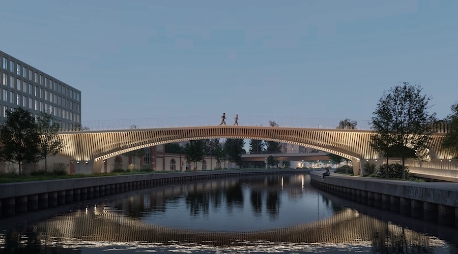 Aux abords du site Alstom, une seconde passerelle piétonne s’intègrera quant à elle dans le paysage de la future cité judiciaire. Cette dernière adoptera une approche sans mécanisme de levage, au profit d’un franchissement en pente douce. Le tracé culminera à 7 mètres de hauteur pour permettre le passage des péniches, tout en restant accessible aux personnes à mobilité réduite grâce à une pente de 5 %, ce qui en fait un ouvrage d’environ 350 mètres de long, souligne Christophe Aubertin, architecte du cabinet Studiolada.