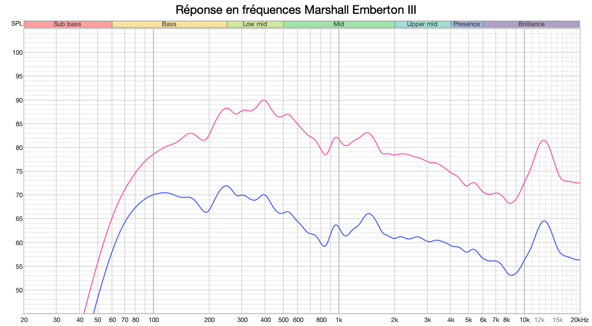 C’est l’un des points forts incontestables de l’Emberton III. Marshall annonce 32 heures d’autonomie, et nos tests confirment cette excellente performance, sauf lorsqu’on écoute au-delà de 80 % et alors il faut compter sur une grosse dizaine d’heures. En écoute à volume modéré (autour de 50 %), les 30 heures sont atteintes. Cela la place parmi les meilleures du marché.