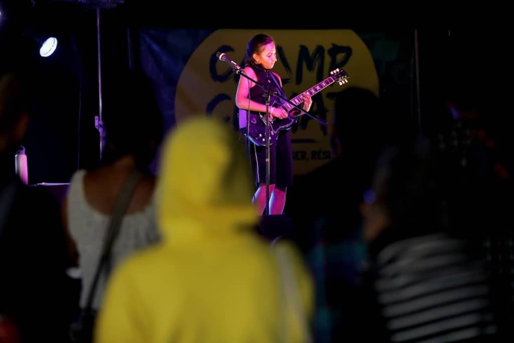 Après le déjeuner, Oumeima, membre d’Alternatiba, se repose dans sa tente : «Au bout d’un moment, on parle tellement qu’il me faut un petit temps toute seule.» En reconversion professionnelle en CAP cuisine, la Rennaise s’apprête à participer à l’une des centaines de formations que propose le camp toute la semaine : «Comprendre la France qui vote extrême droite» ; «Réussir sa campagne de communication» ; «Coordonner une action de A à Z». La militante a présenté elle-même un atelier sur les «victoires de la lutte écologiste». «Ici, c’est une grande colonie de vacances pour militants», raconte-t-elle. L’un des dénominateurs communs des membres du camp est, disent-ils, l’inquiétude face à l’emballement du dérèglement climatique et face à l’inaction politique. «Je fais moi-même partie de ceux qui dépriment, ajoute Oumeima. Ce moment de joie militante est précieux. C’est important de construire un récit autour des petites victoires et de valoriser le savoir pendant ces ateliers.»