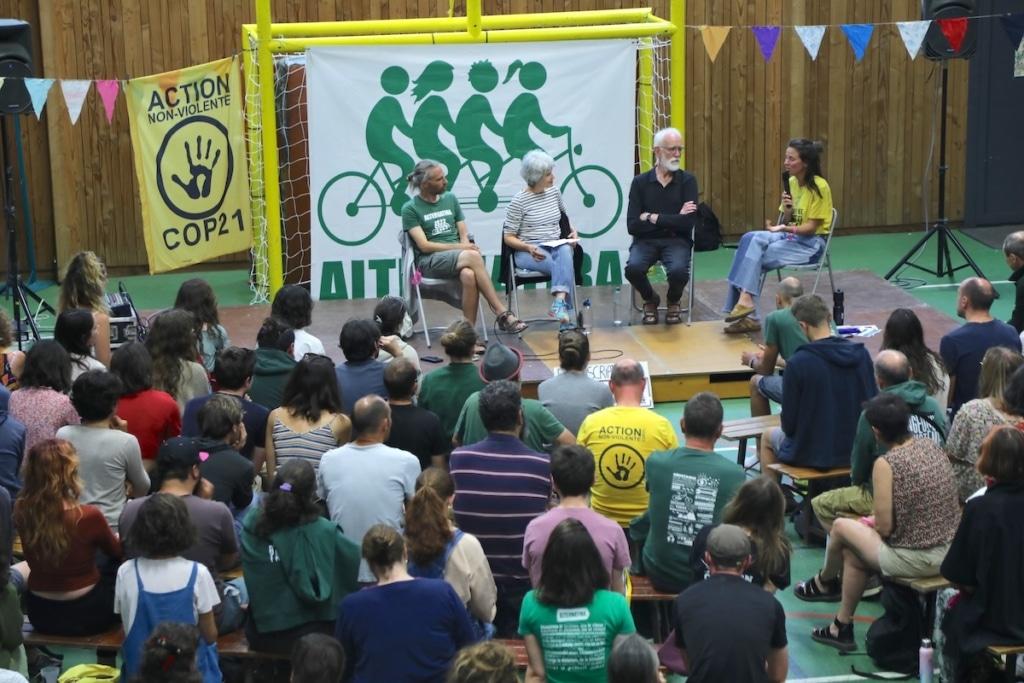 La présidente de l’association de défense des animaux L214, Brigitte Gothière, a été invitée à une table ronde. Même chose pour Wolfgang Cramer, écologue et auteur principal du sixième rapport du Groupe d’experts intergouvernemental sur l’évolution du climat (Giec). Et pour William Aucant, conseiller régional (La France insoumise) de la région Pays de la Loire. Ce dernier se dit séduit par «une énergie [qu’il n’avait] pas ressentie depuis les marches pour le climat au début du quinquennat Macron». L’élu d’opposition réfute l’idée d’un entre-soi : «C’est un lieu de transmission.» William Aucant, qui a été l’un des 150 citoyens tirés au sort pour faire partie de la convention sur le climat en 2019, est intervenu sur le camp dans une conférence sur l’action des collectivités locales dans la transition écologique. «Il faut trouver une alliance entre la rue et les institutions. La rue pousse et les institutions portent, poursuit-il. On ne pourra pas avancer sur la question climatique tant qu’on n’aura pas réglé la question démocratique.»