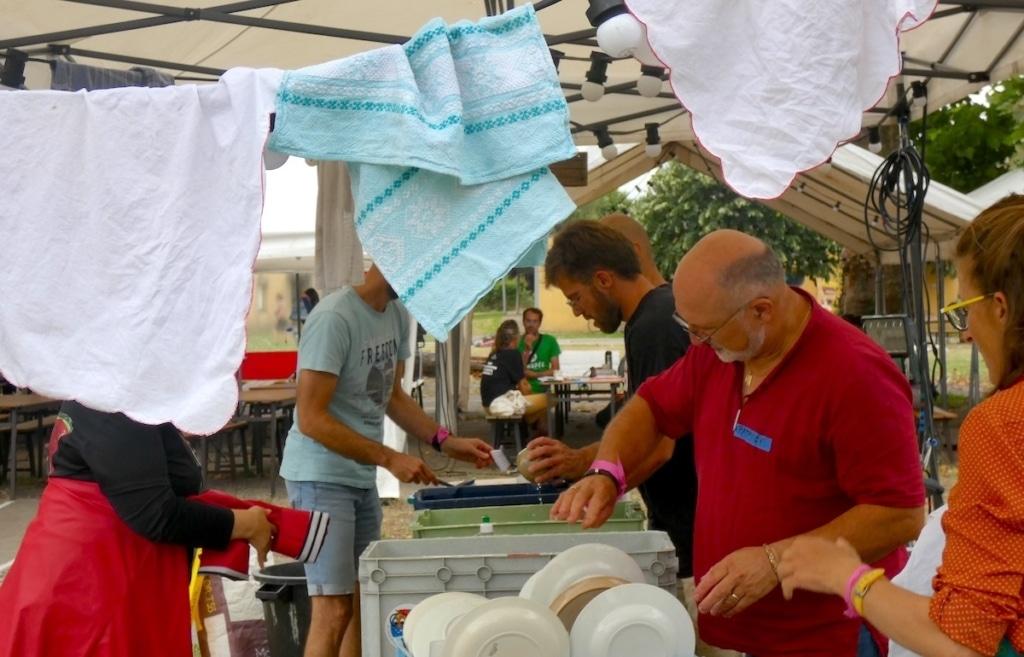 «Ah merde, il pleut.» Paz, chargée de relation dans le secteur de la finance en Loire-Atlantique, met les torchons à l’abri et reprend la vaisselle : «C’est cette ambiance bienveillante que j’aime. Je viens chercher de l’empathie ici.» À ses pieds, les restes d’un taboulé vegan et sans gluten – «Évidemment», rit-elle – et une salade de fruits finissent dans un petit composteur. «Dans mes cercles familiaux et au bureau, j’ai l’étiquette de l’écolo reloue, poursuit la Nantaise. Ici, pendant quelques jours, je suis avec des gens conscients [du dérèglement climatique], qui ont la volonté d’agir.» Concrètement : alerter sur les effets du réchauffement climatique et encourager à diminuer les émissions de gaz à effet de serre d’origine humaine.