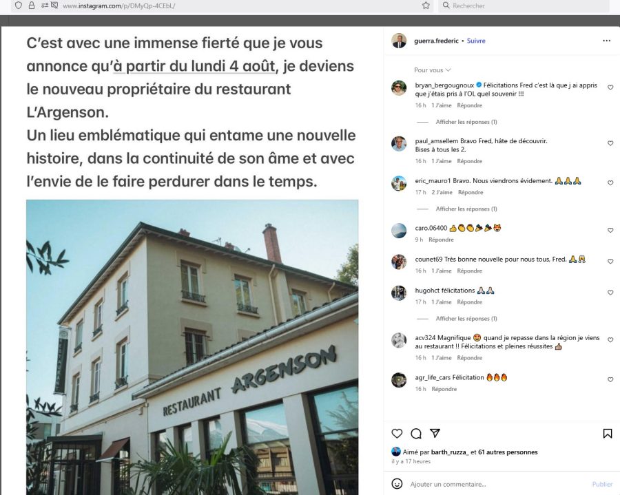 Associé de Christophe et Magali Argenson depuis 2013, mais en désaccord avec eux, cet agent de joueurs de foot récupère les clés de l’établissement lundi 4 août 2025, annonce-t-il dans un post instagram repéré par nos confrères de Lyon Mag.