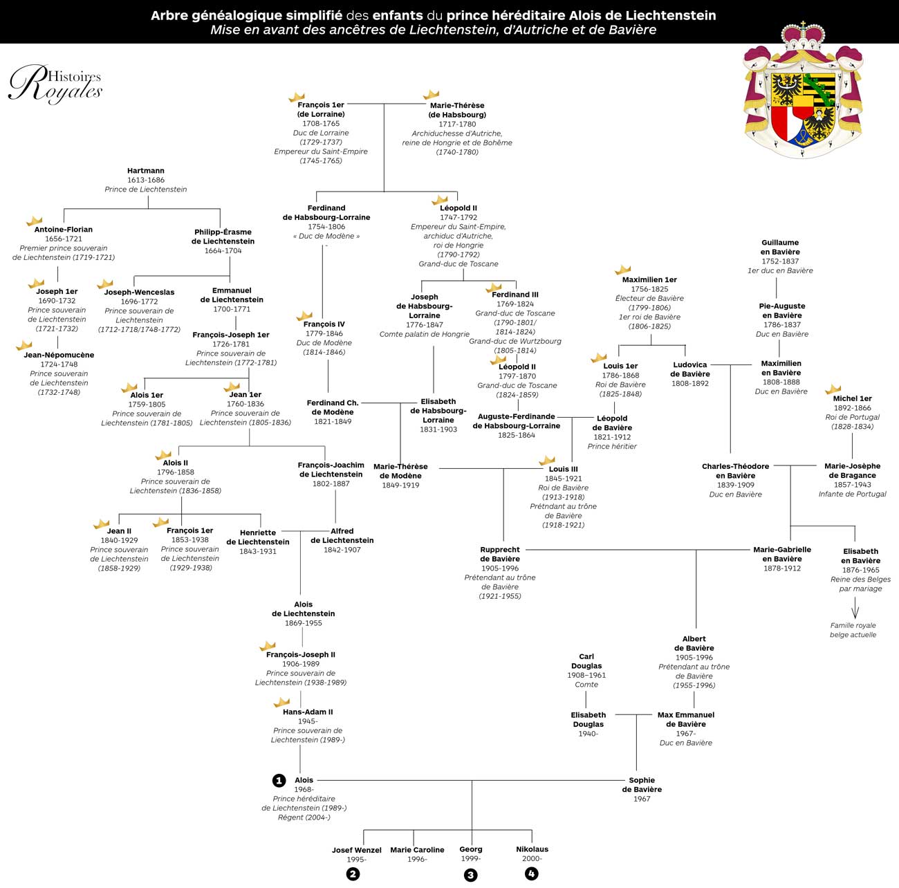 Arbre généalogique simplifié de la princesse Marie Caroline de Liechtenstein, descendante des rois de Bavière et des empereurs d’Autriche (Image : Histoires Royales)