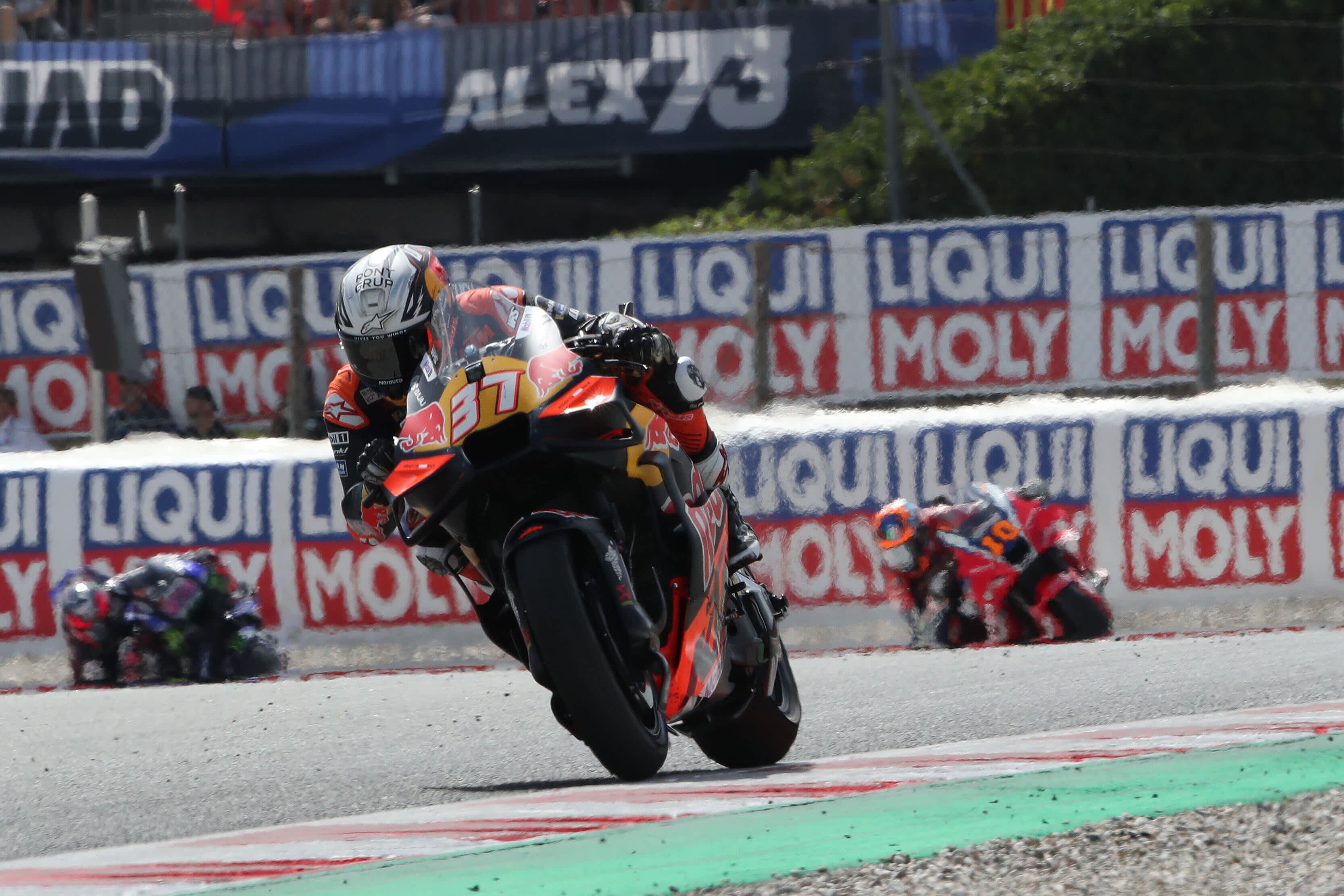 Derrière les deux Espagnols, Enea Bastianini a retrouvé des couleurs. Après un début de saison compliqué, l’Italien de Ducati a pris le meilleur sur Pedro Acosta à mi-course pour filer vers une troisième place synonyme de premier podium de l’année. « J’ai donné 100 % aujourd’hui. Ce podium est une récompense pour mon équipe et mes proches », a confié un Bastianini soulagé.