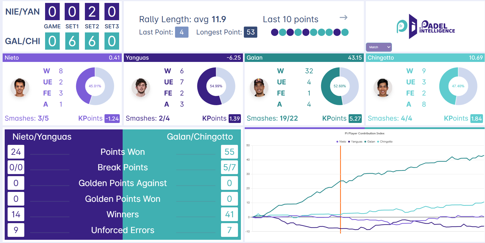 Le second set offre un peu plus de résistance. Yanguas tente de varier, Nieto réduit les fautes, mais impossible de trouver la brèche. La tête de série 2 reste injouable : précision chirurgicale, intensité physique constante, défense infaillible. Résultat : 6/2 et une démonstration qui confirme l’écart entre les deux paires. Sur l’ensemble du match, Galán et Chingotto affichent 41 coups gagnants pour seulement 7 fautes directes, du haut niveau.