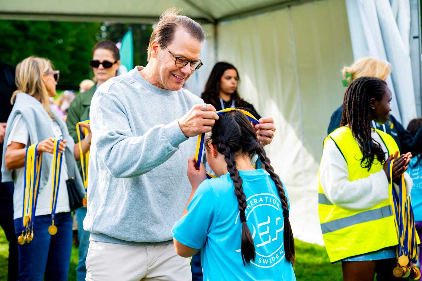 Le prince Daniel était seul cette année pour remettre les médailles aux jeunes participant de la course qui porte son nom (Photo : Mischa Schoemaker/ABACAPRESS.COM)