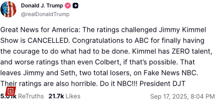 Parallèlement au commentaire de Donald Trump, le président de la FCC (équivalent de l’Arcom) Brendan Carr a indiqué dans une interview à Fox News que cette décision « totalement inédite » prise contre Jimmy Kimmel marquait un « tournant » et qu’il restait « encore beaucoup de travail », évoquant lui aussi les autres talk-shows à l’antenne. Il s’est félicité que « les diffuseurs américains se décident à penser aux intérêts de leur communauté » et a qualifié les talk-shows comme celui de Jimmy Kimmel de « tribunaux bas de gamme progressistes de New York et Hollywood (…)qui renforcent des idéologies politiques étriquées. »