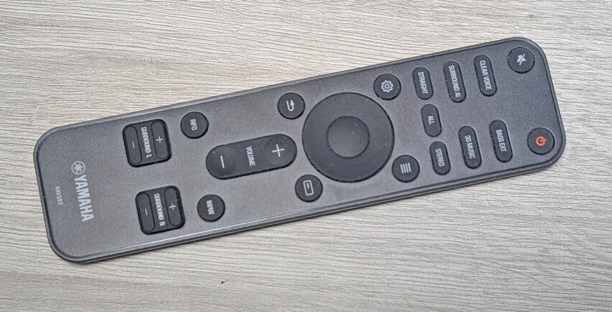 La Yamaha True X Surround 90A est livrée avec une télécommande dédiée au design sobre et qualitatif. Elle est pensée pour offrir un accès intuitif à toutes les fonctions essentielles du système. D’un format allongé et très ergonomique, cette télécommande permet de sélectionner instantanément les sources, d’ajuster le volume général, les basses, ou de couper le son d’une simple pression.