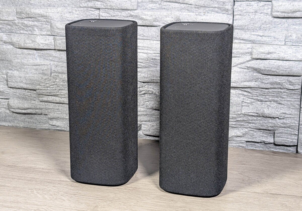 Ce principe n’est pas nouveau notamment déjà vu sur les barres de son JBL, mais disons qu’il est très pratique. En effet, il suffit de les placer sur leur socle dédié pour les recharger, puis de les disposer de part et d’autre du canapé pour une immersion optimale. Il est même possible de les utiliser en tant qu’enceintes Bluetooth indépendantes, offrant ainsi de la polyvalence dans les usages audio quotidiens.