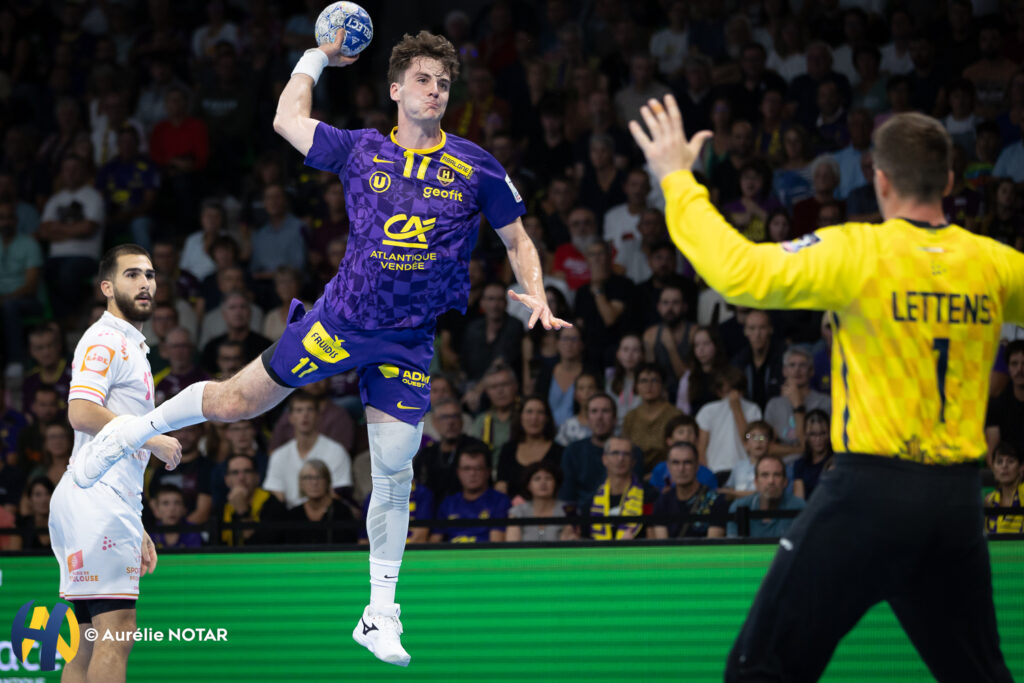 À 400 km de là, Thibaud Briet ouvre le festival dans une H Arena à guichets fermés. Malgré les retours de Minne et Rivera, la confiance n’est pas là. À l’image de Nicolas Tournat, qui manque ses deux premières tentatives, ce sont les Provençaux qui prennent l’avantage (2-5, 6’). Décomplexés et sûrs de leur handball, les Istréens, menés par un Borges impérial, continuent de tenir la dragée haute aux Nantais. Sans paniquer, et grâce à un Noam Leopold (5/5) inspiré, comme ce tir dans le dos à la 13e minute, repasse devant (10-9, 15’). Les Nantais reviennent alors à leurs fondamentaux : une défense solide et des montées de balle rapides. Résultat, un 9-0 infligé aux visiteurs (de 6-9 à 15-9, 23’). Après plus de 13 minutes de disette offensive, c’est l’ancien de la maison nantaise, Guénolé Gaillard, formé au club, qui redonne un peu d’air aux Provençaux. Un souffle vite coupé, Istres butant sur Ivan Pesic et subissant la loi nantaise (18-11, 30’).