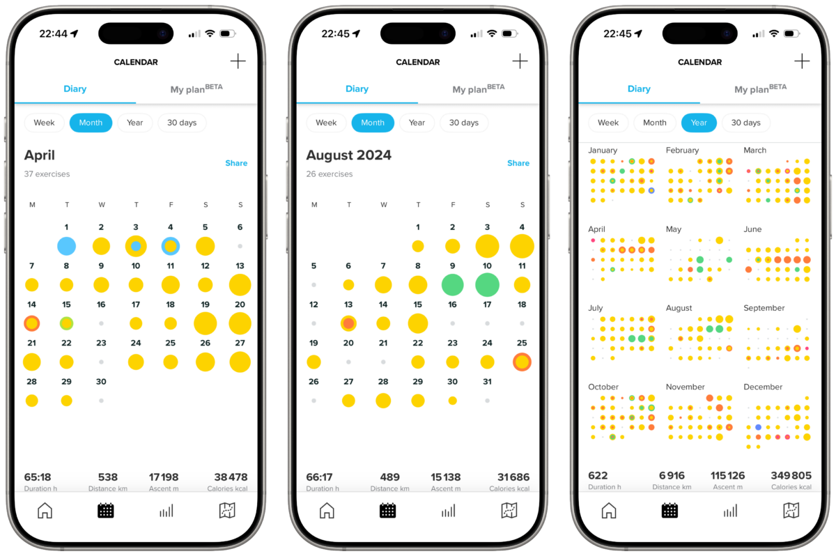 Mention spéciale à cette fabuleuse vue calendrier (hebdomadaire, sur 30 jours glissants, mensuelle ou annuelle) qui affiche un rond de couleur plus ou moins gros en fonction des activités réalisées, avec des totaux de volume horaire, de distance et de dénivelé positif. Je crois qu’à elle seule, cette partie de l’application me retiens chez Suunto.