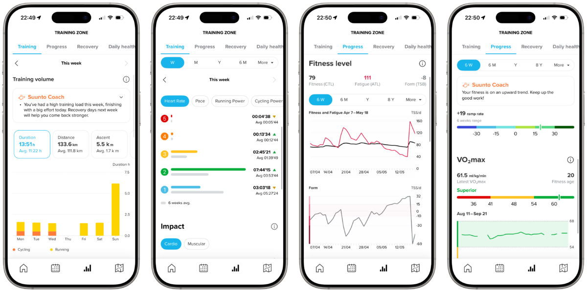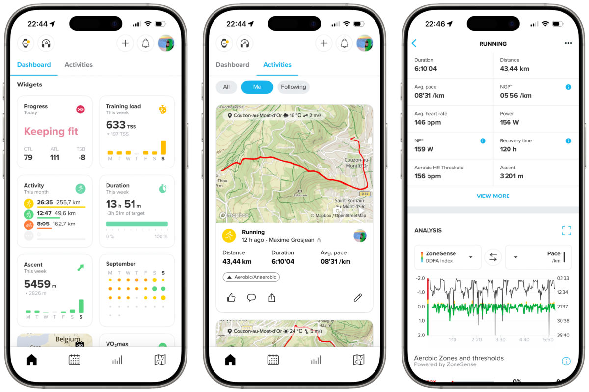 Restons sur l’application justement. Celle de Suunto est certainement la plus minimaliste des applications de montres de sport, en offrant toutefois assez d’informations pour comprendre son entraînement et bien progresser. Côte à côte avec celle de Coros, c’est l’une de mes applications préférées du milieu. Suunto n’hésite d’ailleurs pas à remodeler son application, là où Garmin semble coincé — peut-être pour ne pas brusquer une partie historique de ses clients.