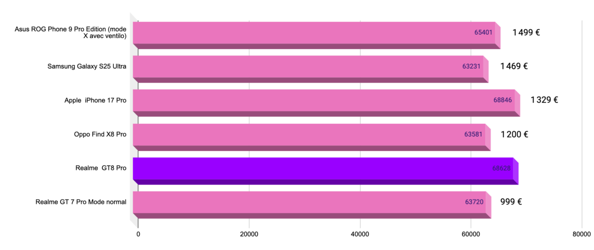 Le Snapdragon 8 Elite Gen 5 est, sans surprise, un monstre de puissance. Sur le prototype du Realme GT 8 Pro, les scores sont excellents et le placent au sommet des classements, rivalisant directement avec l’A19 Pro de l’iPhone 17 Pro et dépassant sans difficulté les puces de la génération précédente.