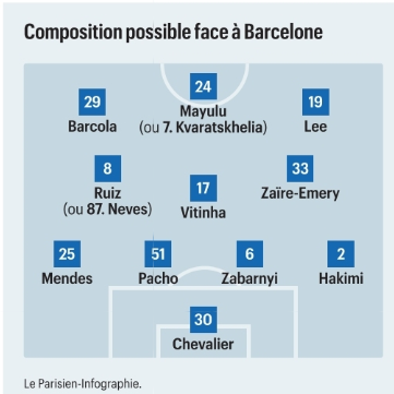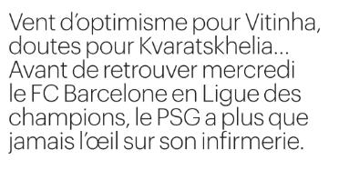 Il est difficile de savoir aujourd’hui quel onze le PSG pourra aligner contre le Barça. Luis Enrique sait déjà surprendre, mais il y a en plus du flou sur les disponibilités. On comprend l’impatience, sauf que le plus sage est attendre des nouvelles officielles. Peut-être qu’il y aura un communiqué dès aujourd’hui, après des examens passés par Vitinha et Khvicha Kvaratskhelia. Il y aura aussi ce mardi l’annonce du groupe pour voyager à Barcelone, puis l’entraînement sur place afin d’avoir des indications.