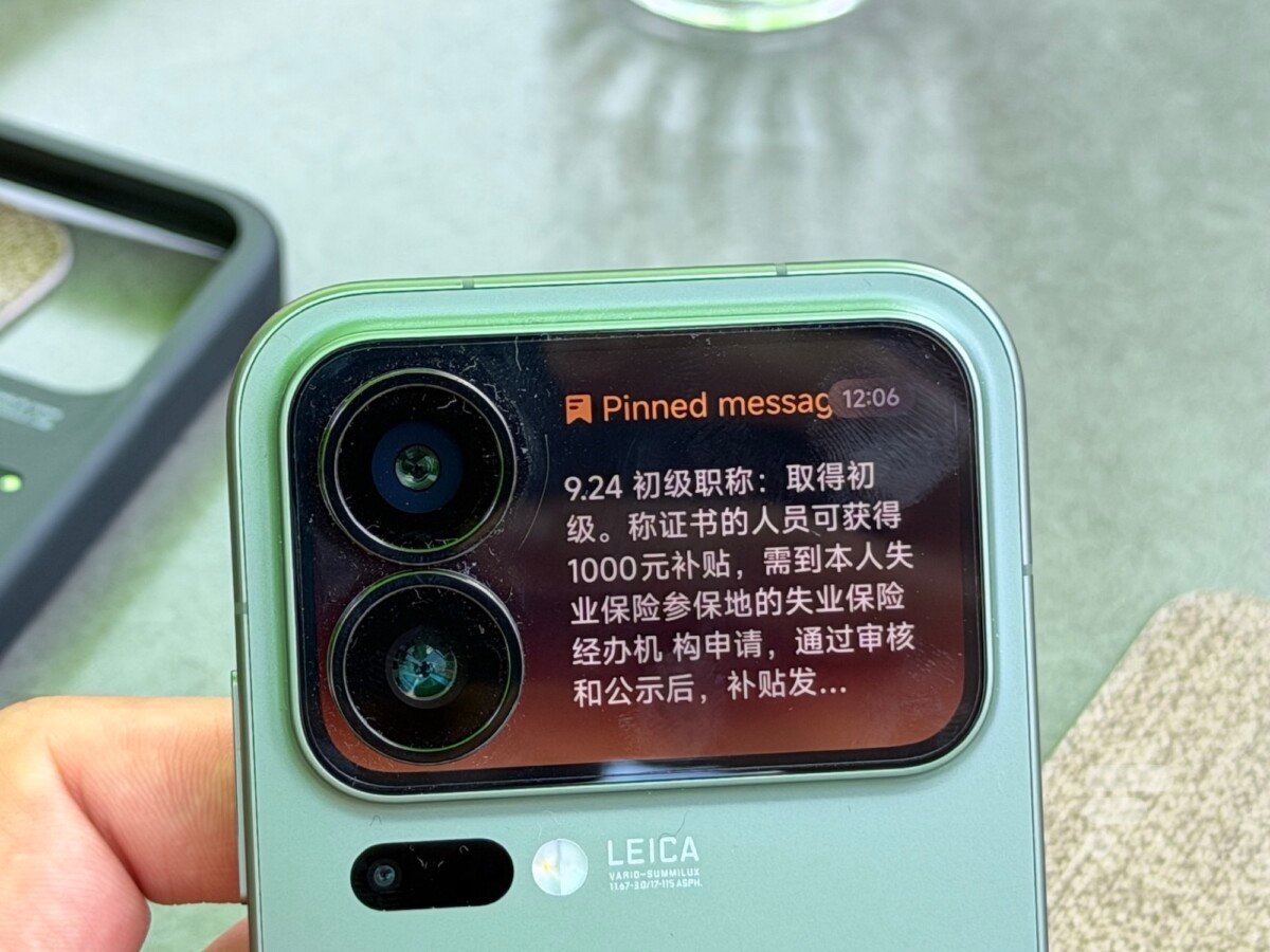 Mais la vraie surprise se trouve à l’arrière : Xiaomi a intégré un second écran AMOLED, discret, mais fonctionnel, dans la partie haute du dos, comme sur les Mix Flip de la marque. Une originalité qui n’est pas là que pour le style comme nous allons le voir.