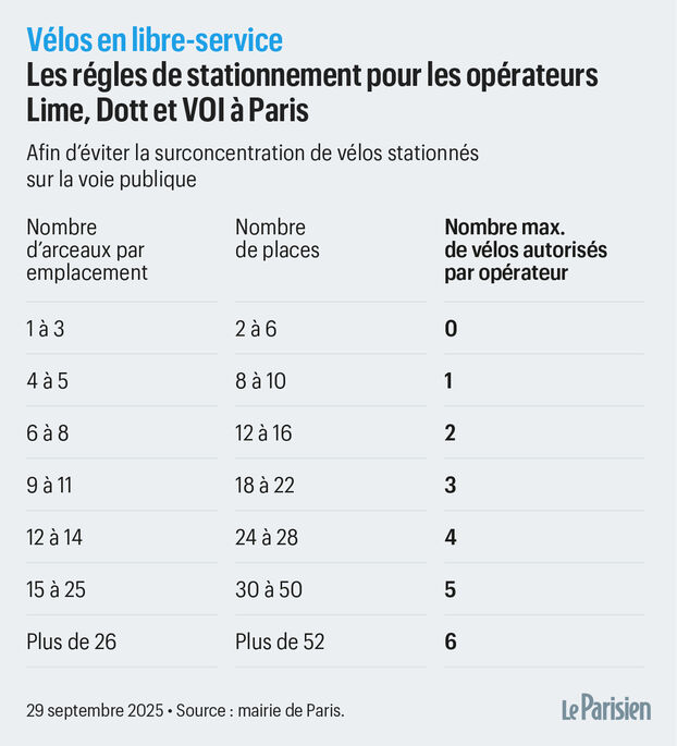 « Lorsqu’il y a entre un et trois arceaux, c’est-à-dire six places pour vélos, le stationnement est interdit pour les engins en libre-service. De quatre à cinq arceaux, un vélo en libre-service par opérateur peut stationner. De six à huit arceaux, c’est deux vélos ; de neuf à onze arceaux, trois ; etc. Jusqu’à 26 arceaux, où six vélos en free floating peuvent prendre place », détaillait encore David Belliard.