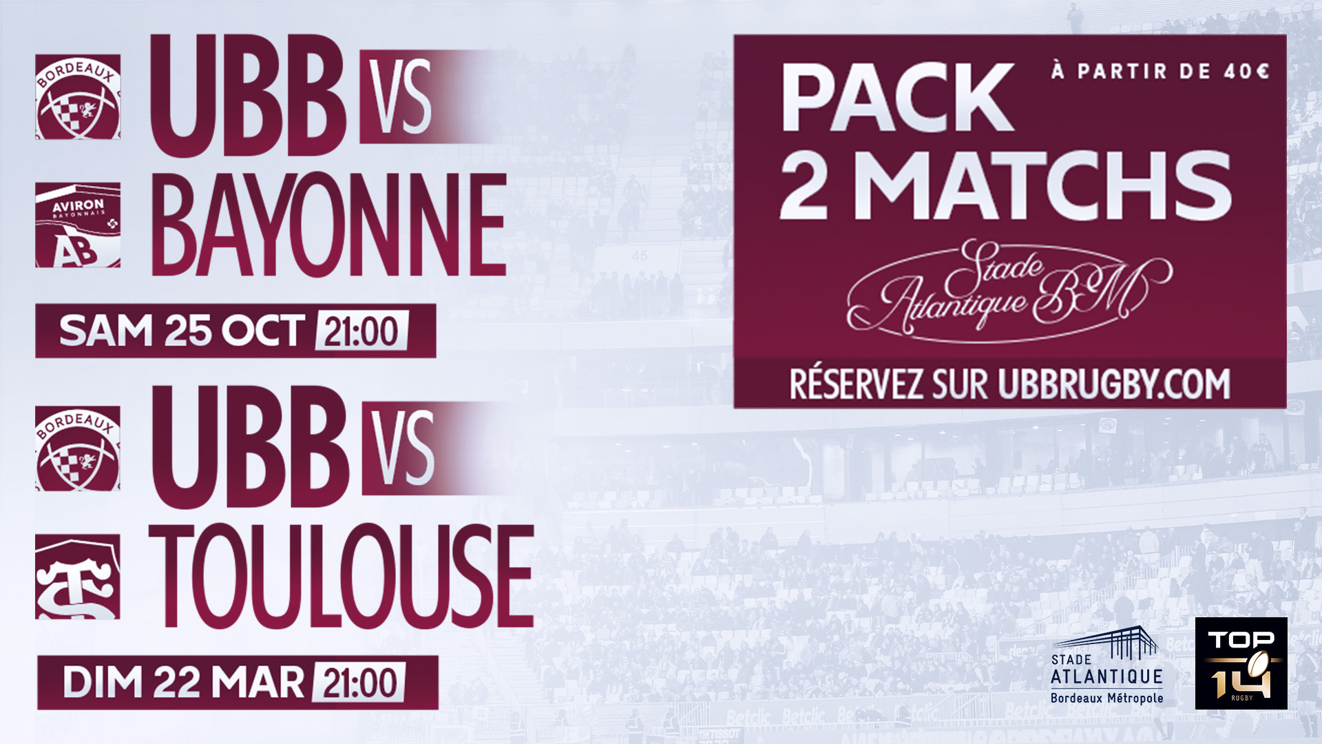 Vous pouvez dès maintenant achetez vos packs pour les deux réceptions délocalisées au Stade Atlantique BM. Pour rappel, l’UBB affrontera d’abord l’Aviron Bayonnais le samedi 25 octobre prochain à 21h00 dans le stade de Bordeaux-Lac puis le Stade Toulousain le dimanche 22 mars à 21h05 !