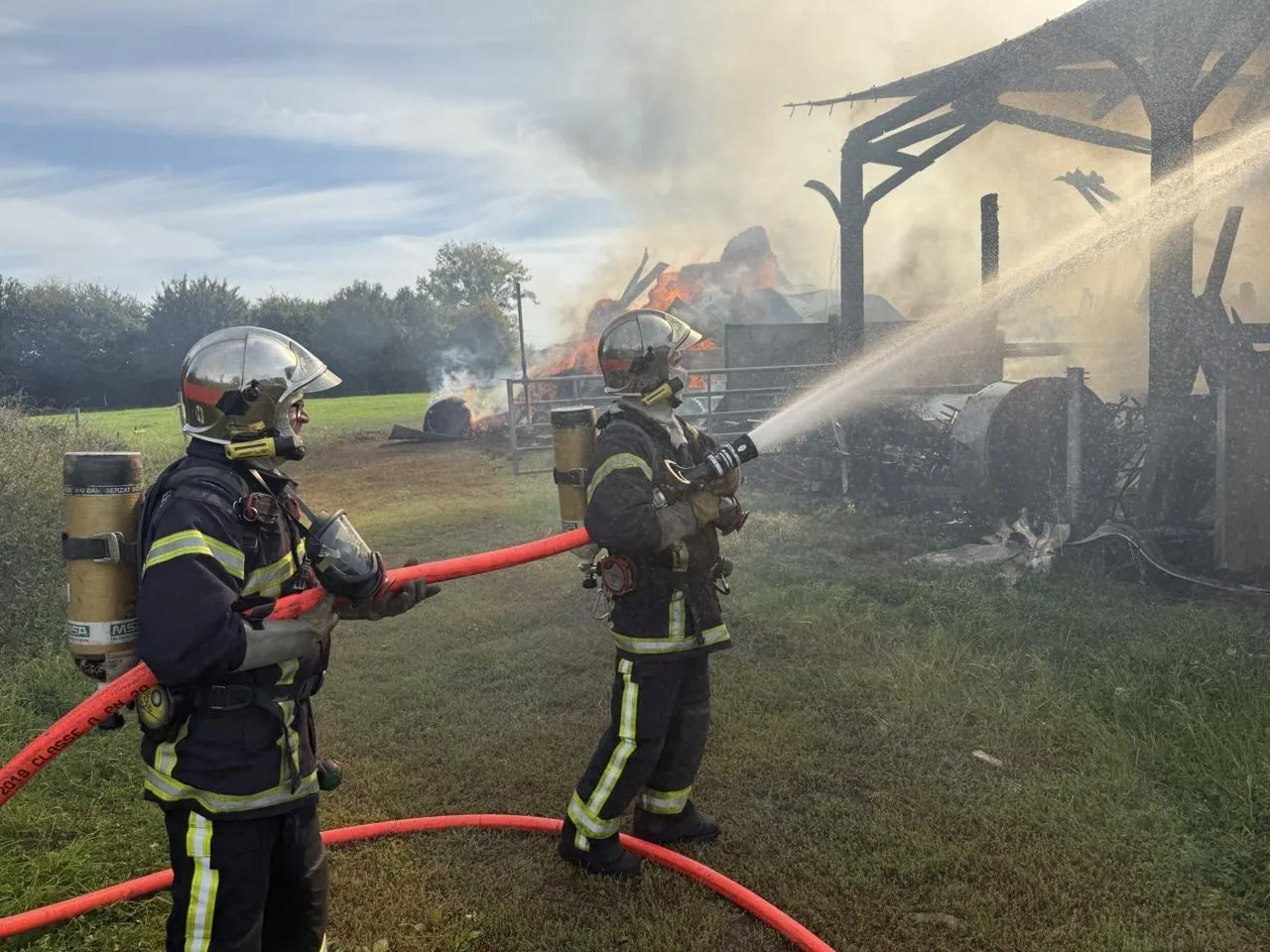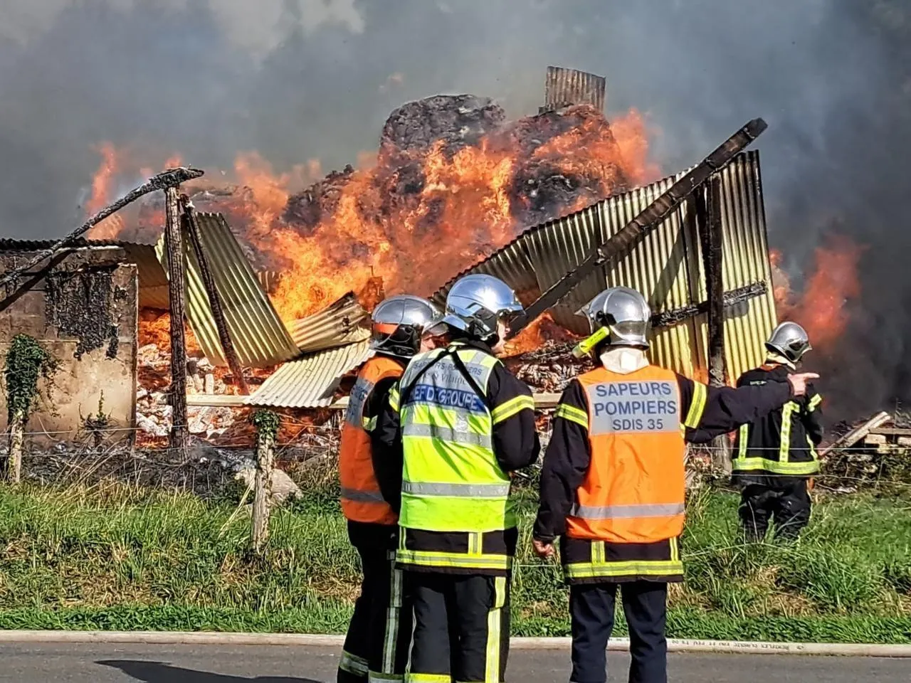 Une quarantaine de pompiers ont été mobilisés sur un feu de ferme à Saint-Aubin-d’Aubigné, au nord de Rennes, mercredi 1er octobre 2025. © SDIS35