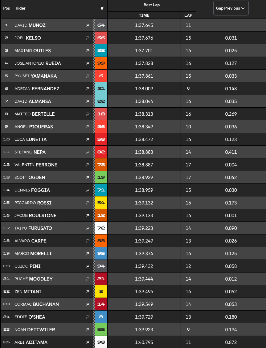 Le pilote espagnol signe le meilleur temps de la FP1 en Indonésie devant Joël Kelso et Máximo Quiles. José Antonio Rueda, leader du championnat, s’adjuge lui le quatrième temps. Ryusei Yamanaka complète le Top 5.