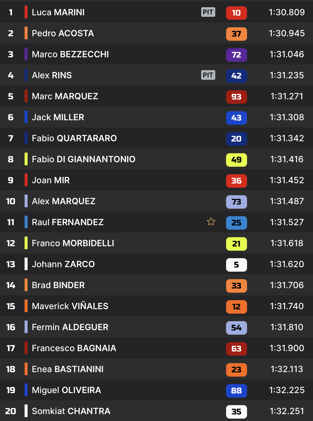 Trotz der Abwesenheit von Jorge Martín, der seit seinem Sturz im Sprint des Japan GP wegen einer Schlüsselbeinverletzung ausfällt, kann Aprilia auf die gute Form von Marco Bezzecchi zählen. Der Italiener, Marquez’ Hauptkonkurrent zu Beginn der Session, fuhr mit 1:31.046 die drittschnellste Zeit, knapp hinter Pedro Acosta. Damit belegen fünf Marken in der Endabrechnung des FP1 die ersten fünf Plätze.
