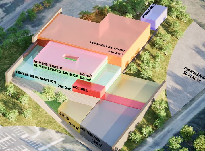 Les bâtiments du projet SCABB Valley, sont projetés à l’ouest de la déjà existante Arena. A droite sur cette projection architecturale aérienne transmise par le SCABB