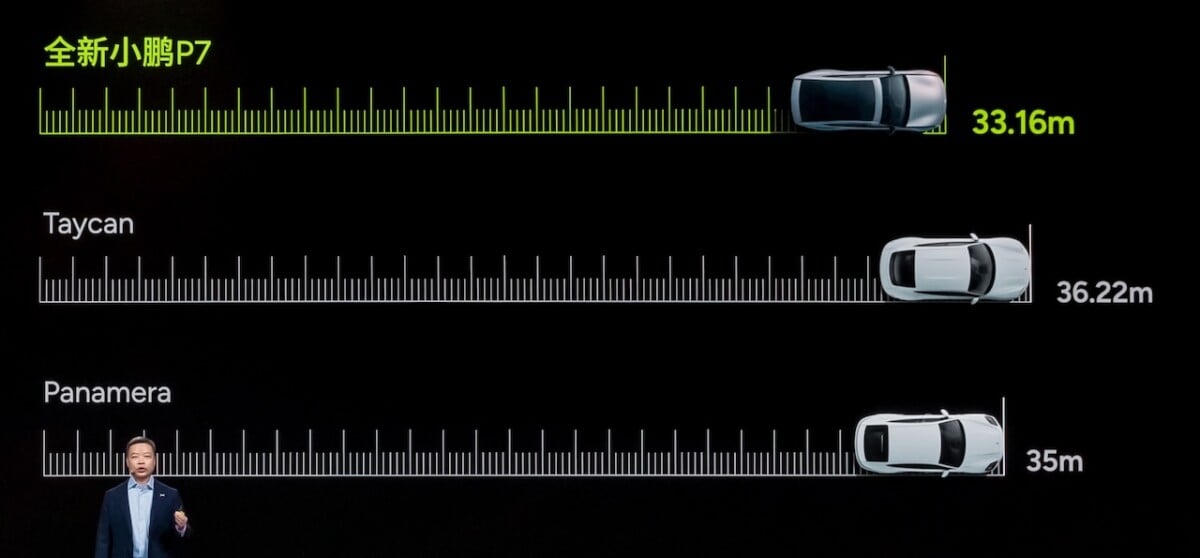 Comparatif de la distance de freinage de 100 à 0 km/h entre la P7 et les Porsche Taycan et Panamera.