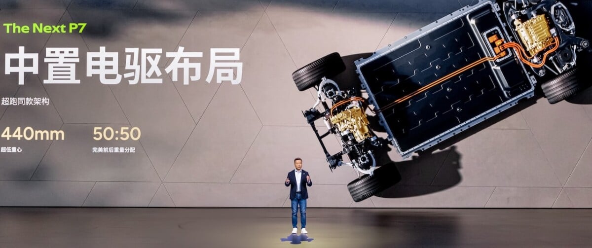 La P7 2025 repose sur une architecture à motorisation électrique centrale permettant une répartition des masses proche de 50/50 et un centre de gravité abaissé à 440mm.