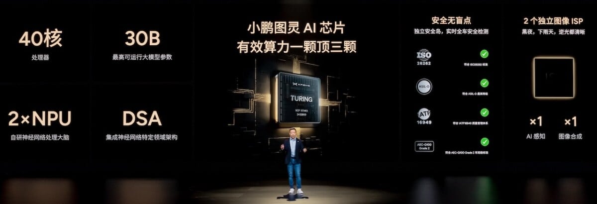 La P7 2025 inaugure une plateforme similaire à la G7 que nous vous avions présenté il y’a quelques mois mais en rajoutant une puce Qualcomm 829P aux puces Turing développant déjà 2,250 TOPS de puissance de calcul. Cette puissance de calcul servira à alimenter le modèle d’IA VLA (Vision-Language-Action) embarqué.