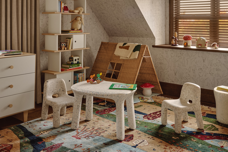 On retrouve dans la chambre de l’enfant les tables et les chaises en jouets recyclés de la marque belge ecoBirdy, l’une des collections les plus populaires de Goodee.