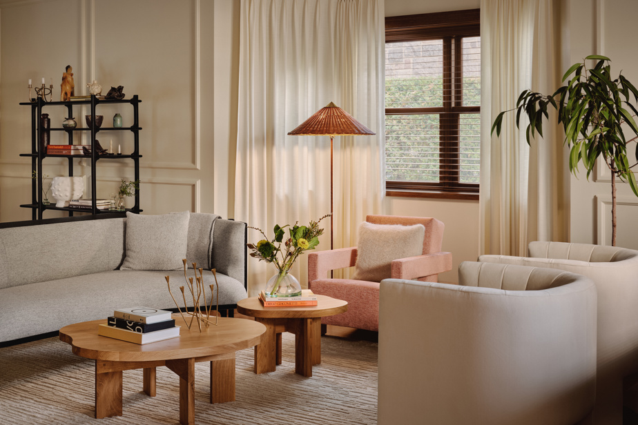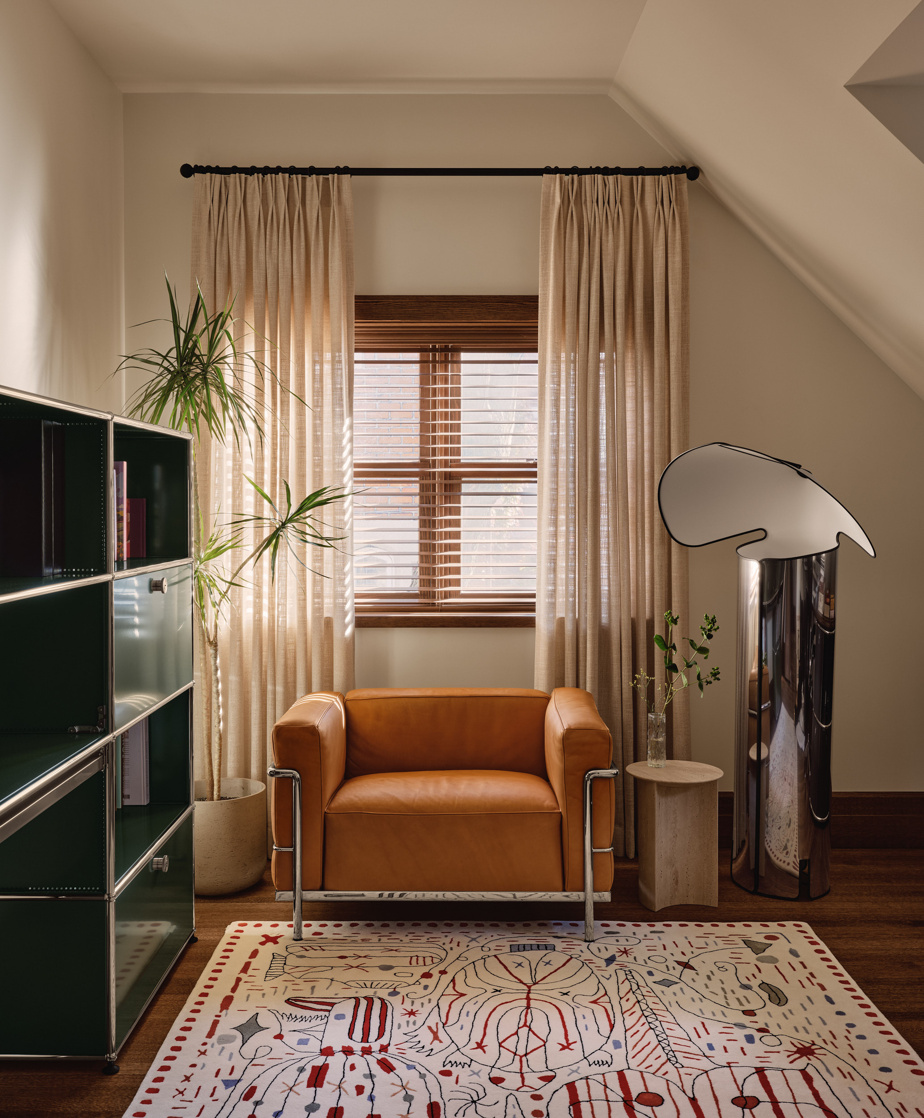 Depuis que le projet de Goodee a pris de l’ampleur au Canada, mais aussi à New York, Miami et Los Angeles, le binôme a élargi sa sélection de produits venus des quatre coins du monde et ouvert, le printemps dernier, sa première boutique, à Westmount. Alors que de nombreux objets de la maison figurent au catalogue de la marque, d’autres sont arrivés ici grâce à la passion des propriétaires pour le design scandinave et leur volonté de soutenir la création locale comme l’illustre un luminaire sculptural de la collection Beaubien de Lambert & Fils dans un coin du séjour. « Avec la banquette que nous avons restaurée à l’aide d’un cuir végétal et d’un tissu en velours, et le petit rideau à l’arrière de celle-ci, ce coin me fait penser à une brasserie. Il permet aussi de gagner de la place dans le salon », remarque Byron.