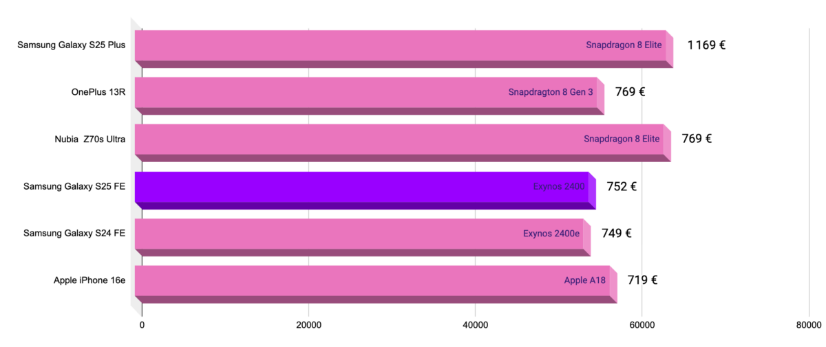 Les résultats du Galaxy S25 FE sont également très proches de ceux observés sur les smartphones haut de gamme de l’année dernière, qui intégraient la puce Snapdragon 8 Gen 3 de Qualcomm.