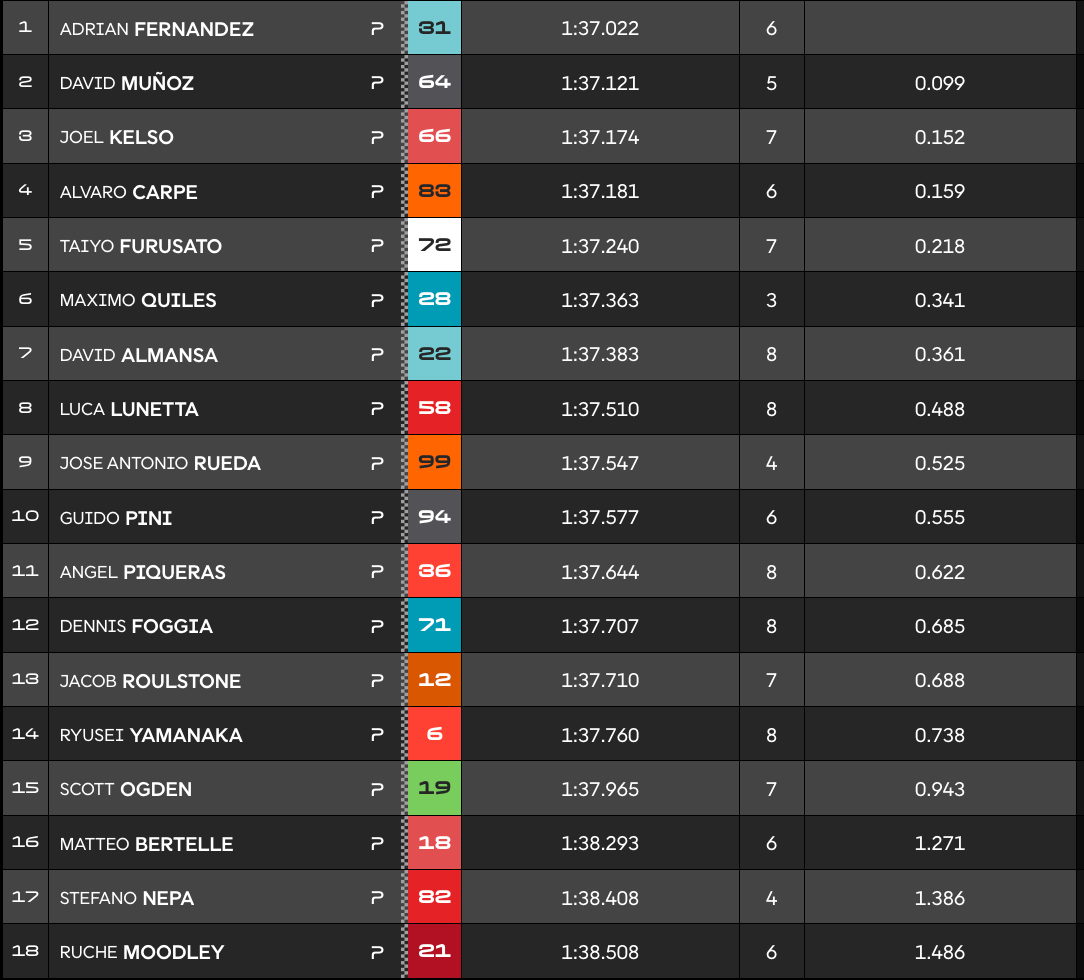 Alvaro Carpe ménera lui la deuxième rangée devant Taiyo Furusato et Maximo Quiles. José Antonio Rueda, qui joue une balle de match dimanche s’éléancera devant Guido Pini et son plus proche rival pour le titre, Angel Piqueras.