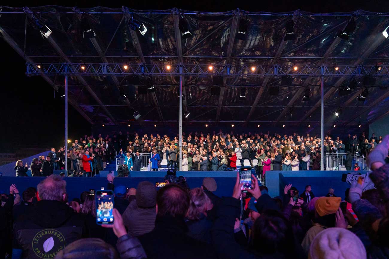 Un spectacle en plein air, sur une scène à 360 degrés, a conclu de façon magistrale les célébrations du changement de trône. Le grand-duc Guillaume et la grande-duchesse Stéphanie, mais aussi le grand-duc Henri et la grande-duchesse Maria Teresa, ont assisté à ce spectacle mettant en valeur la diversité de la scène musicale luxembourgeoise. La fratrie du nouveau grand-duc et la fratrie de l’ancien grand-duc étaient aussi présentes dans la tribune d’honneur.