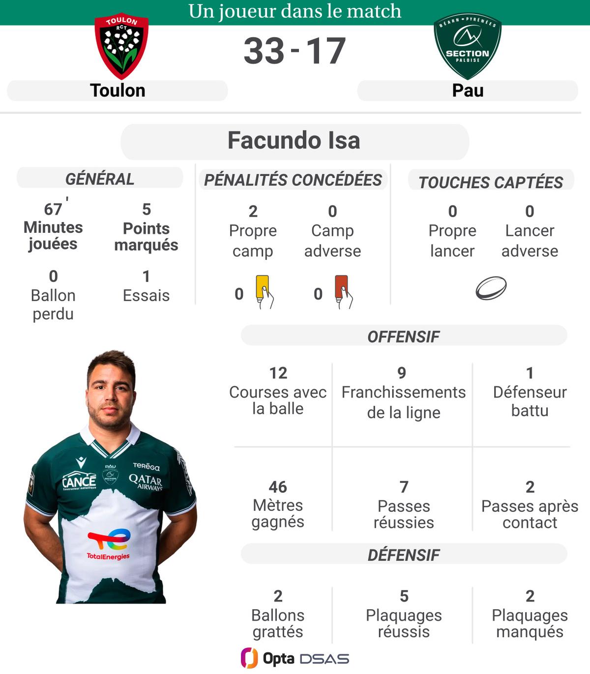 Dans une équipe paloise dominée dans les collisions, Isa a fait ce qu’il savait faire de mieux : avancer (12 courses avec la balle, 46 mètres gagnés). Souvent pour pas grand-chose au vu des nombreuses incursions paloises dans les 22 m toulonnais sans point au bout. Le trentenaire parvient tout de même à marquer en force le premier essai palois dans le second acte. De quoi faire oublier ses oublis en défense (2 plaquages manqués sur 7 tentés) et sa relative indiscipline (deux pénalités, notamment un hors-jeu sur l’essai refusé de Desperes), sans doute par excès de générosité. Malgré ses deux ballons grattés.
