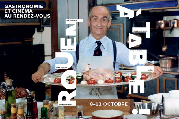 Avec plus de 120.000 participants réunis dans toute la ville, 80 partenaires (producteurs, commerçants, restaurateurs) sept écoles dans le secteur de l’hôtellerie-restauration), la venue de chefs étrangers du réseau Unesco villes créatives en gastronomie, Rouen a célébré l’art culinaire avec succès avec l’opération : Rouen à table. C’est donc tout naturellement que la ville avec ses partenaires propose une deuxième édition, cette année sur le thème du cinéma. Le septième art sera à l’honneur : films célébrant la gastronomie tel l’Aile ou la cuisse avec de Funès. Rappelez-vous sa réplique culte « … le vin, c’est la terre … ». Le parrain de cette édition sera Christophe Mauduit, chef de l’Auberge des ruines à Jumièges.
