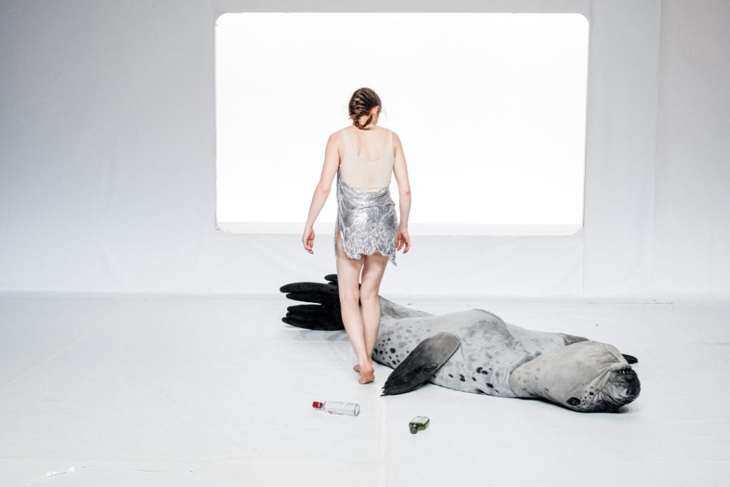 Le rituel envoûtant, qui consiste à vivre sur une terre invivable, se poursuit jusqu’à une ultime séquence. Les corps se meuvent lentement, disparaissent et luttent. Jusqu’à ce qu’un animal marin, phoque ou lion de mer, se dresse sur scène. Il est finalement assassiné par une chasseuse. Lente, étrange, la performance raconte l’Âge de Glace, mais nous fait vivre intimement une expérience que l’on connaît : sous nos yeux, un paysage s’effondre et disparaît. Pas si éloigné de ce que le monde traverse, ces temps-ci. Même lorsqu’elle fait mine de s’en éloigner, la programmation de Fauves nous raconte l’époque.