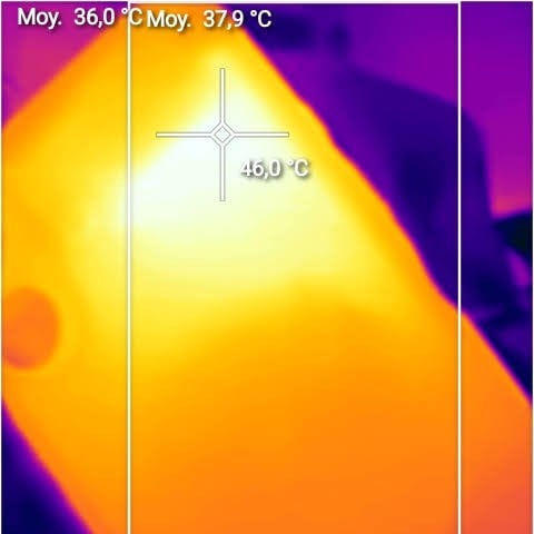 Près de l’appareil photo, nous avons relevé une pointe à 46 degrés Celsius ! C’est carrément brûlant dans cette zone quand on pousse l’iPhone 17 dans ses retranchements (ici, un stress test éprouvant particulièrement le CPU).