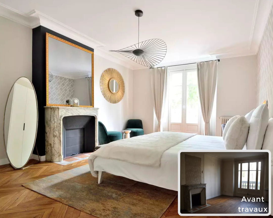 Dans ce grand appartement qui en comptait quatre, la troisième chambre à coucher allait subir un sacré lifting. Restée dans son jus, elle illustrait tout ce qu’il y avait de plus classique et n’attendait que d’être rénovée. On y retrouvait les caractéristiques chères à l’haussmannien : cheminée en marbre, parquet et moulures.