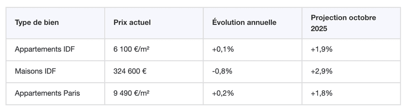 - Une hausse modérée des prix est attendue d’ici octobre 2025 : +1,9% pour les appartements et +2,9% pour les maisons en Île-de-France.