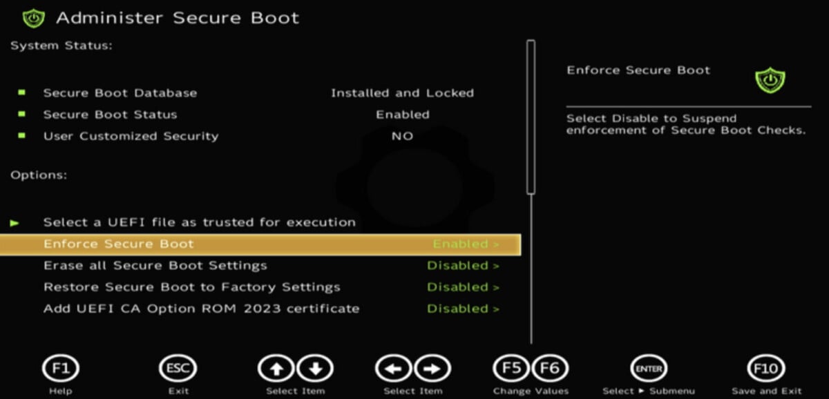 - Cherchez « Secure Boot » dans les menus (souvent dans Security ou Boot)