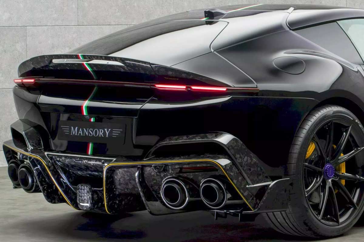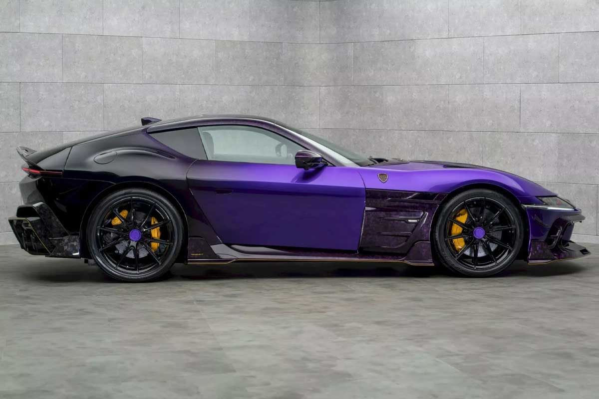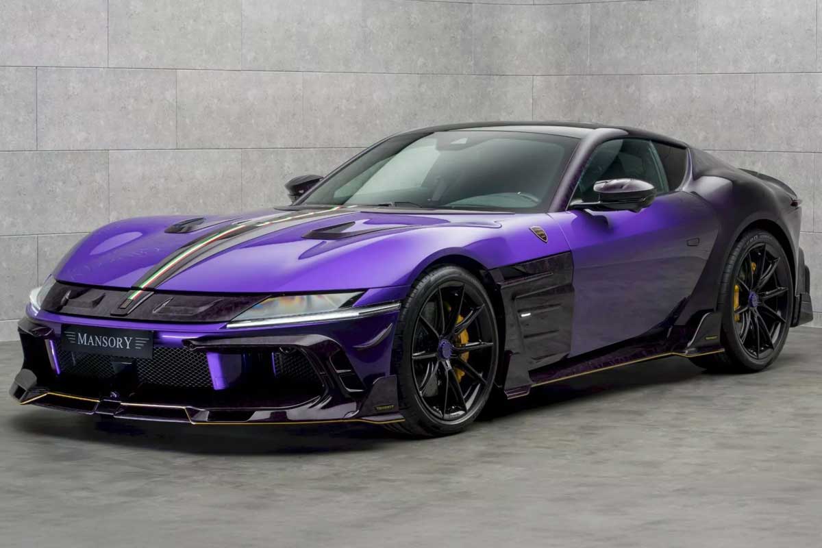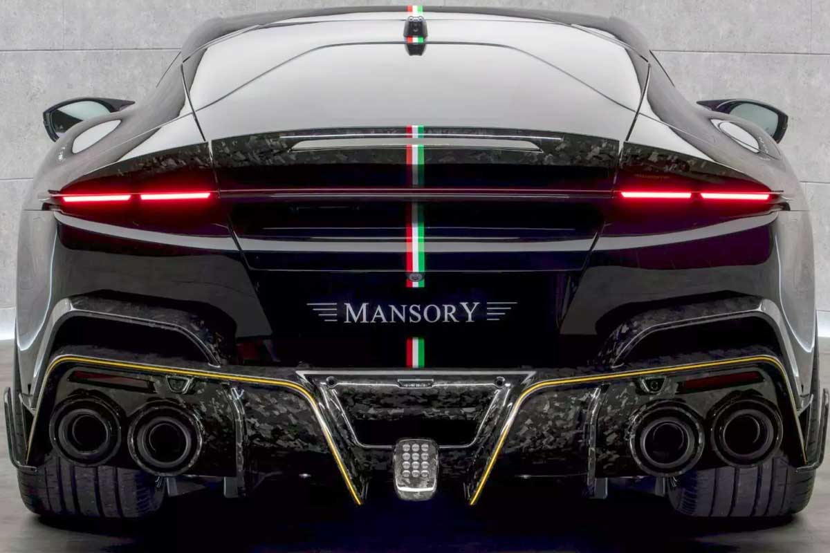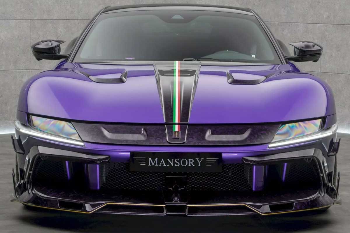 La voiture présentée à Monaco affichait une teinte violet profond contrastée par des éléments noirs et carbone, ainsi qu’une bande aux couleurs du drapeau italien courant du capot à l’arrière. Mansory inaugure aussi de nouvelles jantes forgées VF.5 de 21 pouces à l’avant et 22 pouces à l’arrière, renforçant son allure bodybuildée.
