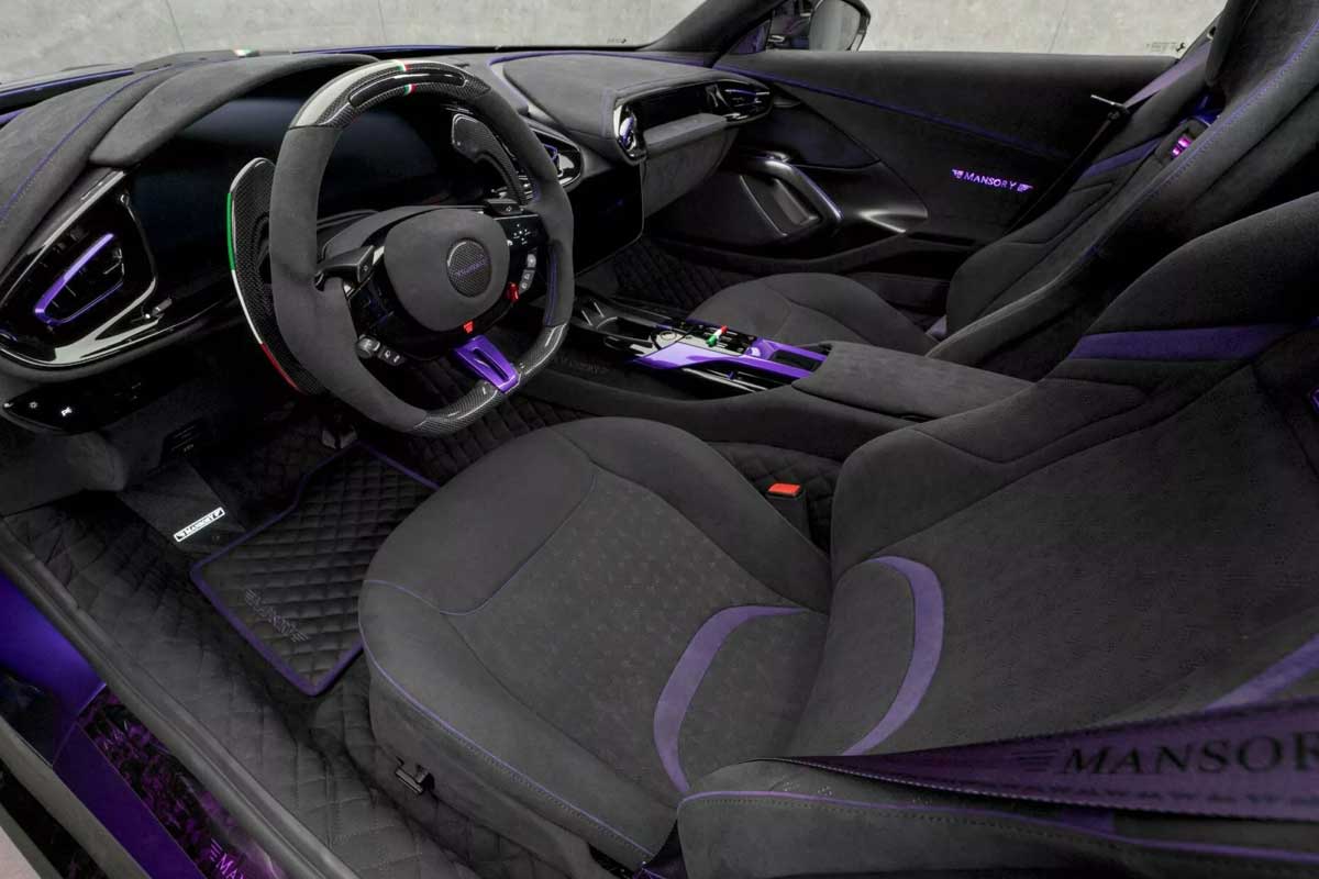À bord, Mansory a poursuivi l’exercice. L’Alcantara gris domine, relevé par des touches violettes et de multiples inserts en carbone. Le préparateur propose même un ciel de toit illuminé de LED, à la manière des Rolls-Royce. Pédales, volant sport, tapis matelassés… l’ensemble respire la personnalisation poussée, chaque client pouvant définir ses propres coloris et matériaux.